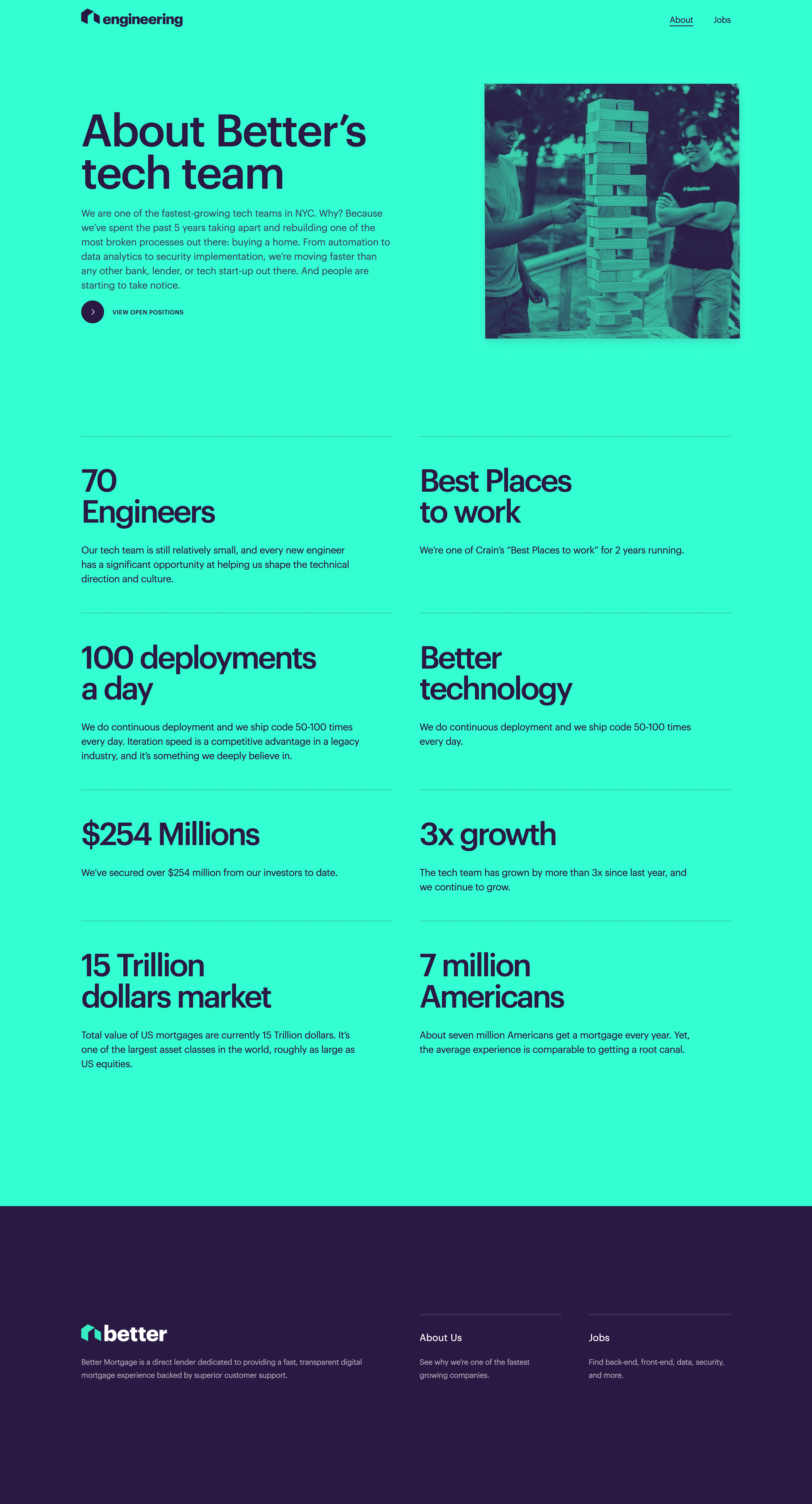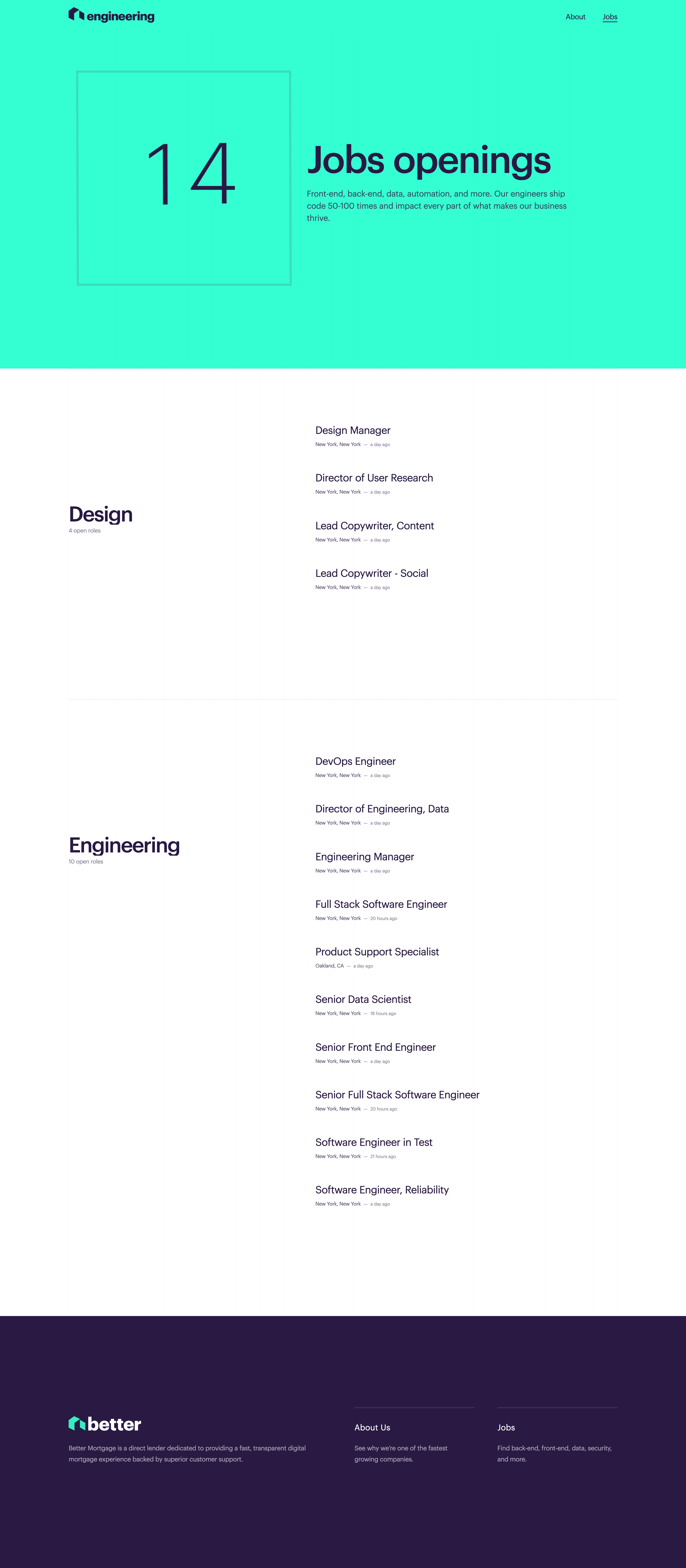 There was already a preexisting blog, but did not have any Better branding, nor spaces to promote Better's engineering team culture and opportunities. I was asked if I could restyle it, make it more "Better-y" and add callouts to current job openings.