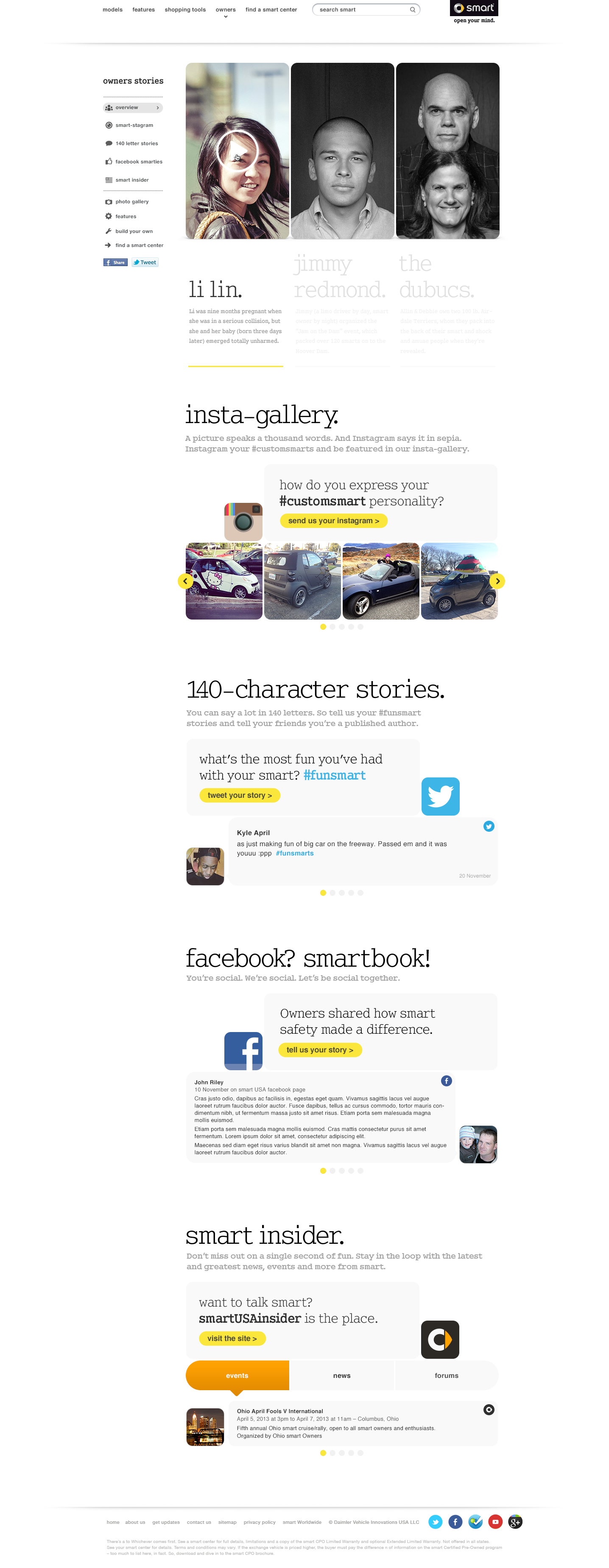 Owner Stories is a hub collecting creative interviews to Smart owners and illustrated by various artists. EV FAQ is an informative page added for the launch of the Smart electric vehicle. Some other advertising and social media initiative are also here.