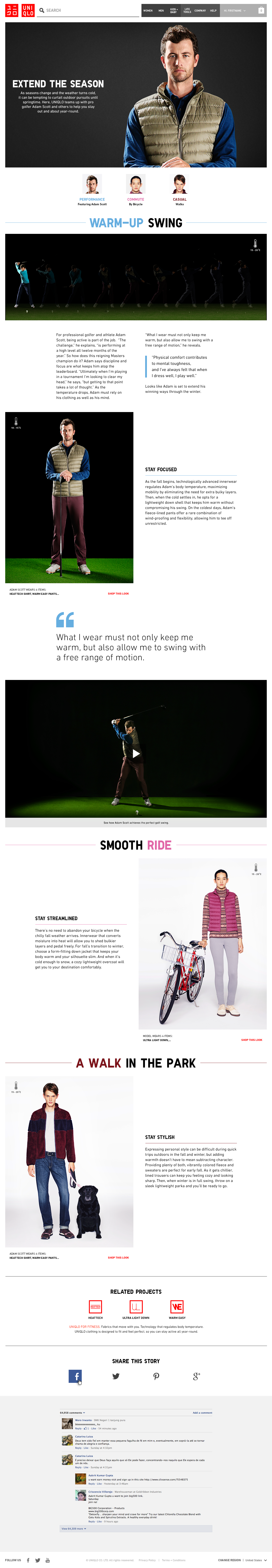 In uniqlo.com v.2, we designed an article page to host editorial content. The plan was to have fresh new content published monthly, weekly or even daily. Extend the Season is using one of these article page template and add some special feature on it: Adam Scott swinging his golf bat.