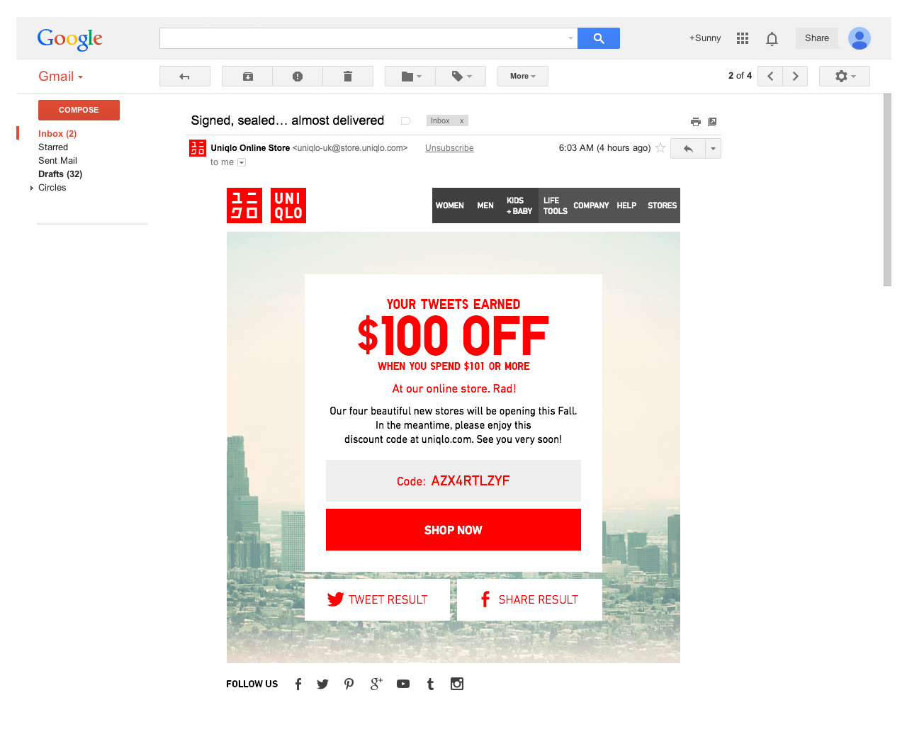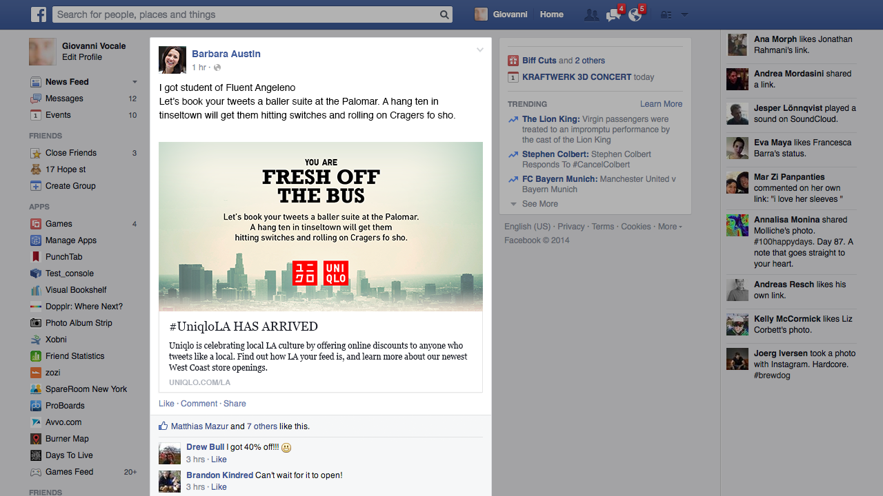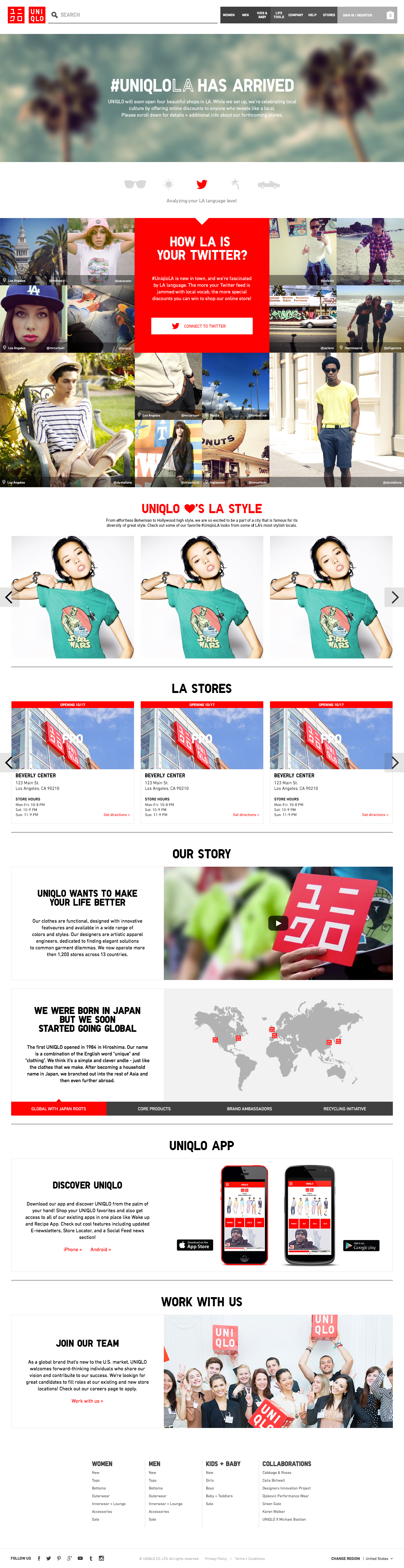 Uniqlo is opening their first store in LA. Through this page, users can scan their twitter account to see if they "tweet like a local", and be rewarded with a coupon code.